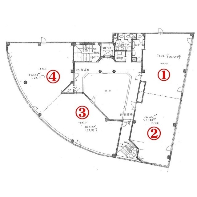 | 備考 | 室内に給排水取り出し口あり。各階に給湯室とトイレ完備、業種はお問合せ下さい |