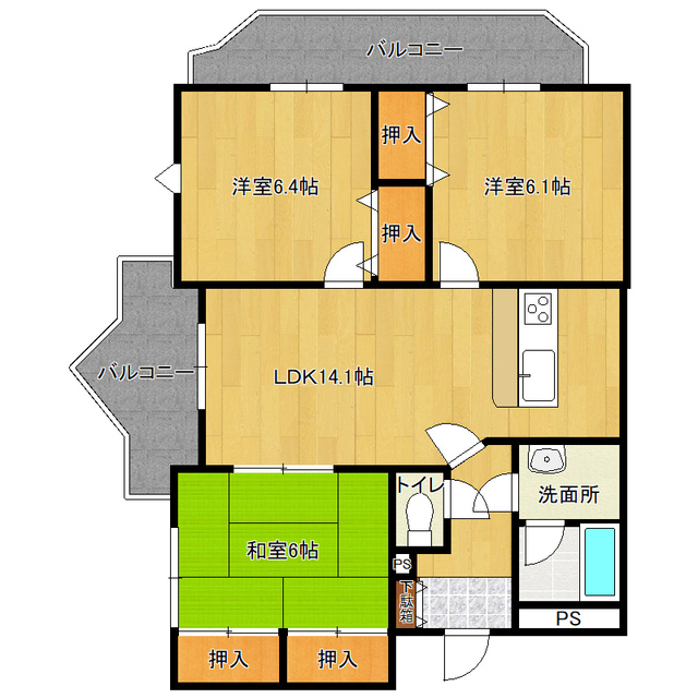 | 間取り詳細 | LDK14.1,洋室6.1,洋室6.4,和室6 | ||
